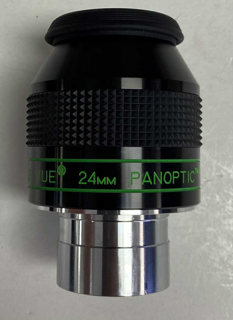 This is a used TeleVue 24mm panoptic eyepiece in excellent condition. The optics are clean and the body is free of any marks or scratches. This includes both dust caps as well as the original box.