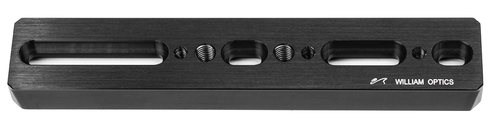 Made with CNC-machined aluminum and anodized, this plate is a Vixen dovetail on one side, for use with telescopes, and is an Arca Swiss dovetail on the other, for use with camera equipment. It includes three 1/4-20 threads, and two 3/8-20 threads. It is 210mm long and weighs 280g.