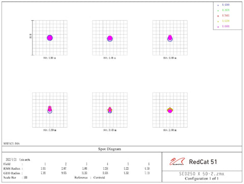 51 mm lens, in a sleek Petzval design, using Synthetic Fluoride (FPL53 and FPL51) glass for a full-frame flat field image. The optical quality provides exceptional performance at a fast focal ratio of f/4.9.