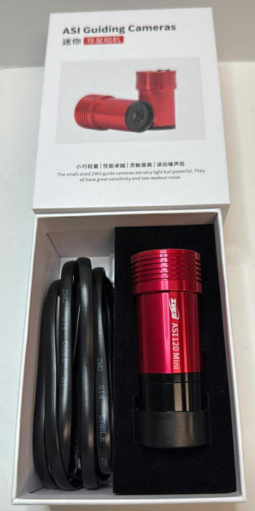 The ASI 120MM Mini is a great first guide camera, with its high sensitivity, features, and low price. Like other cameras in ZWO's lineup of "Mini" models, it has a long barrel to allow easy positioning in a guidescope, like the nose of a regular eyepiece. This also allows a bit of extra adjustment for focus on your guidescope, as necessary.
