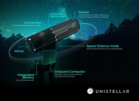 Unistellar's Enhanced Vision is a patent-pending technology that is based on the accumulation of light over short periods of time using a low light sensor, as well as on our proprietary algorithms of image processing that run on an on-board calculation module. The resulting amplified image is projected at infinite focus into the eye of the observer with an extremely high contrast ratio, creating a genuine and live experience of sky observation. Sensor settings and image processing parameters are automatically adjusted.