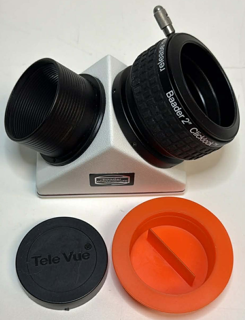 This is a used Baader 2" diagonal with click-lock in very good condition. The optics are reasonably clean, with some minor dust that will not significantly affect your views. We have discounted the item appropriately to reflect this condition issue. The body is free of any marks or scratches. This includes both dust caps but does not come in a box.