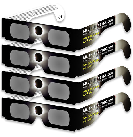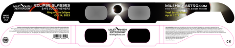 Mile High Astronomy Solar Eclipse Glasses are designed for safe observation of sunspots and the upcoming 2023 Annular Solar Eclipse and 2024 Total Solar Eclipse. Affordable, easy to use, and best of all, Solar Safe, 100% ISO-certified.