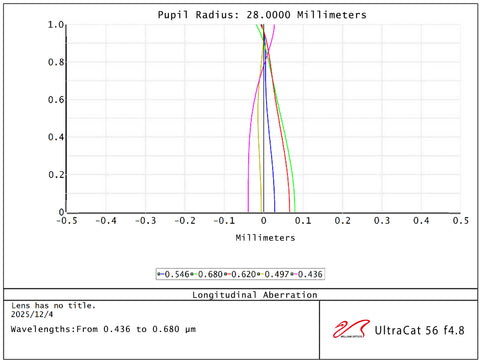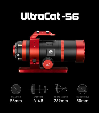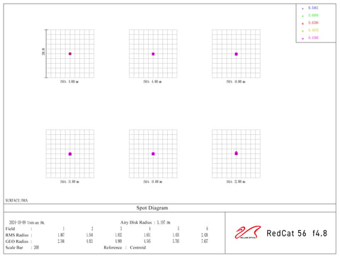 The Ultracat 56 offers an optical upgrade from the venerable RedCat 51, with a superior 5-element advanced Petzval design delivering improved performance out to the corners of full frame sensors. The RMS spot size all the way out to the corners represents a 41% improvement vs the RedCat 51, with tighter RMS across the field for improved performance with high megapixel sensors.