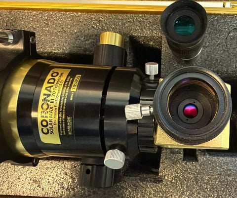 This is a SolarMax III 70mm Double Stack with BF10 diagonal. It is in excellent condition. As you probably know, they don't even make these anymore, so this one won't last! Comes in its original lockable foam-lined case, along with a Vixen dovetail, and a Cemax 18mm Plossl, which is specially coated for H-alpha viewing.