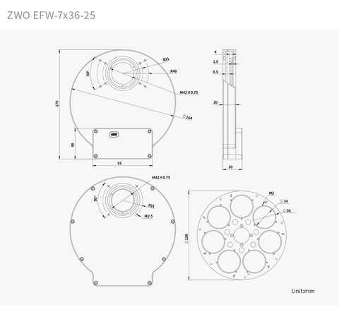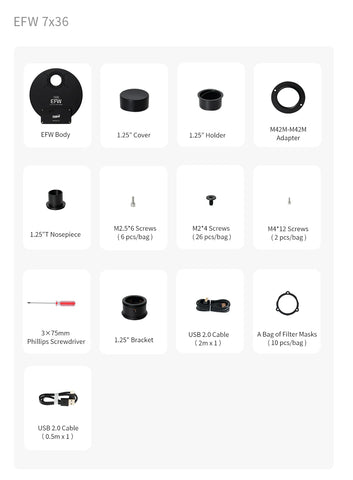 The ZWO Electronic Filter Wheel (EFW) is available in four models, supporting the following filter sizes: