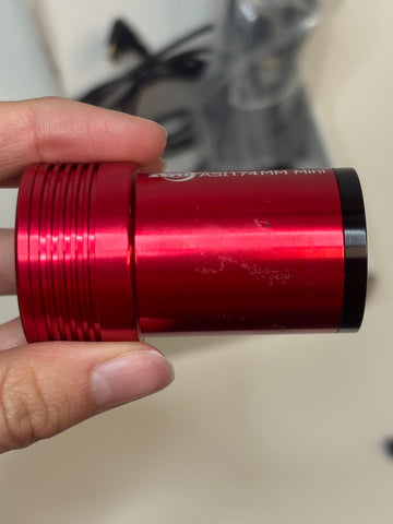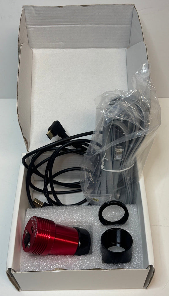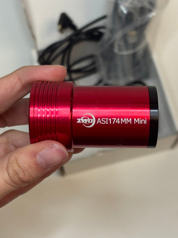 This is a used ZWO ASI174 mini guide camera in great condition. The sensor is clean with minor marks on the body shown in the provided pictures. It comes in its original box with an additional M28.5-CS adapter.